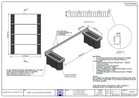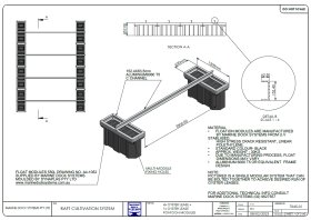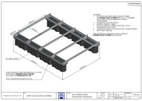 This drawing shows 6 mtr long section x 4.66 mtrs wide. Comtor joining kits can bolt straight on to bolt mulitple sections together. Cross beams can be moved ant bolted in desired location for different size oyster racks / cages. It has anchor points on all four corners and cast aluminium cleats for mooring an oyster barge alongside.