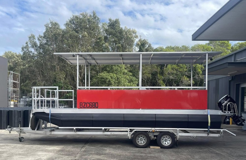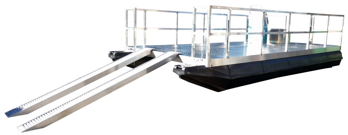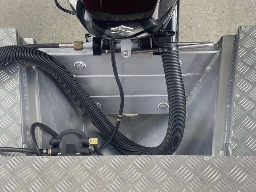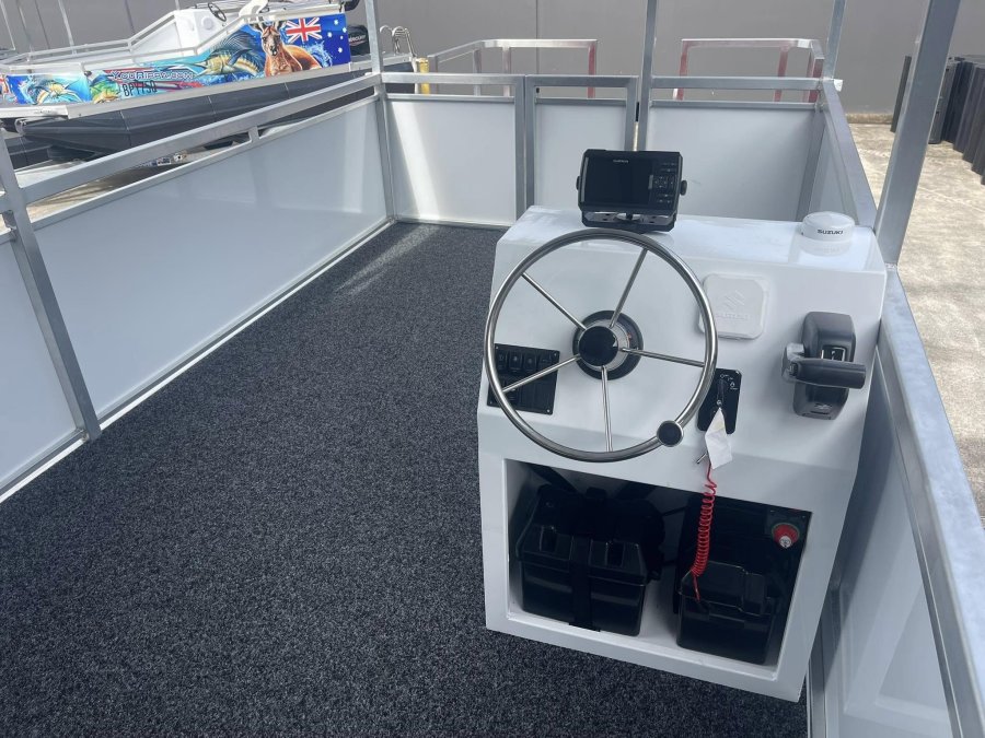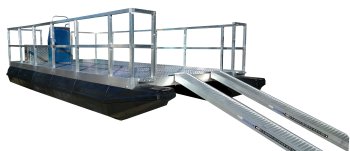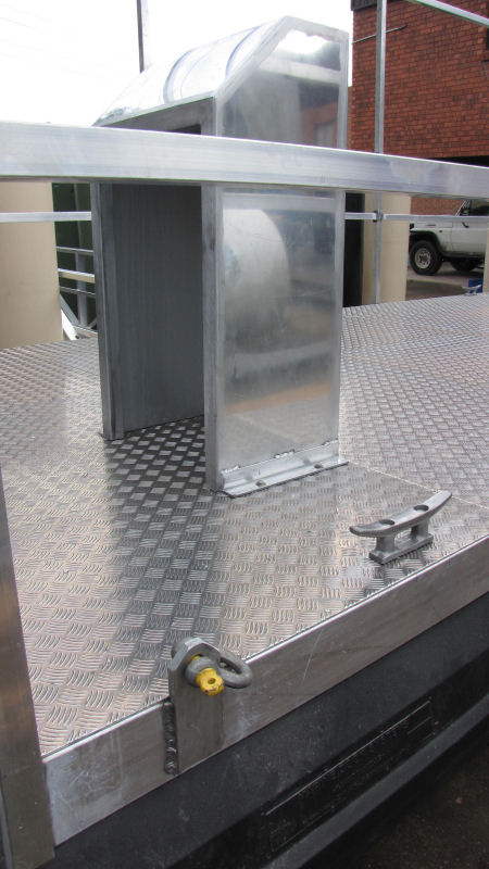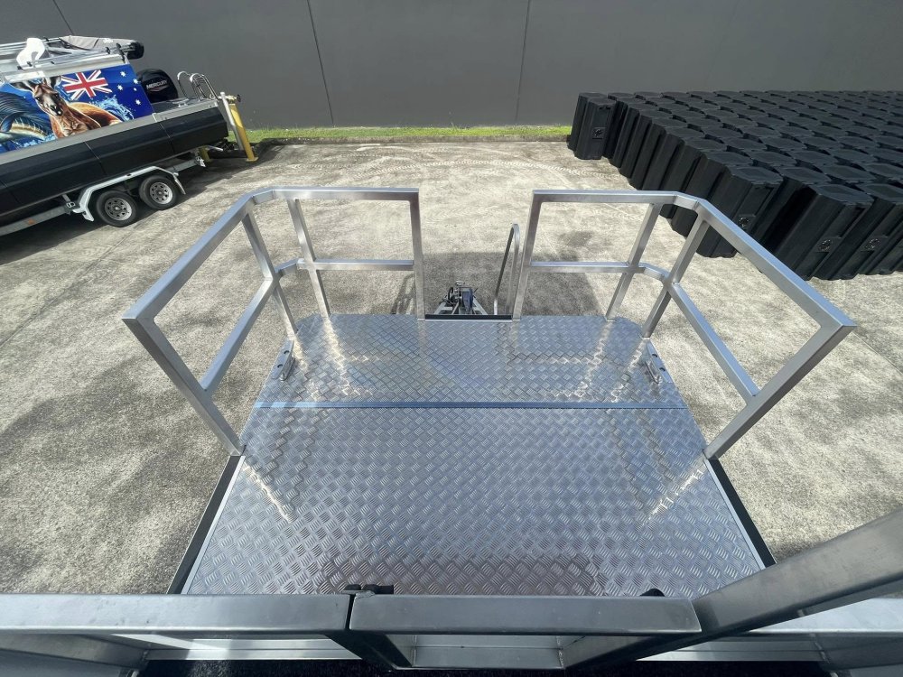 Shown here with alloy access ramps, storage toolbox, motor bracket with step, handrails, and control console. This boat was made to transport quad bikes.
