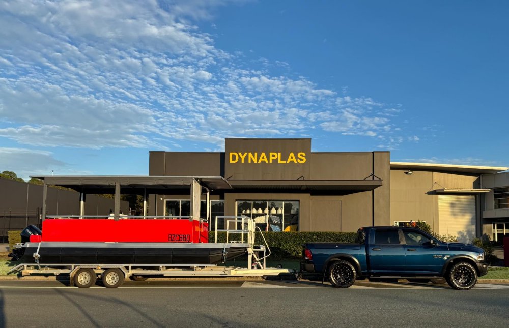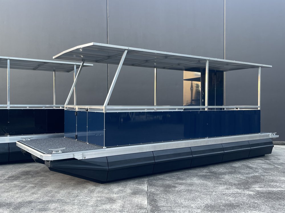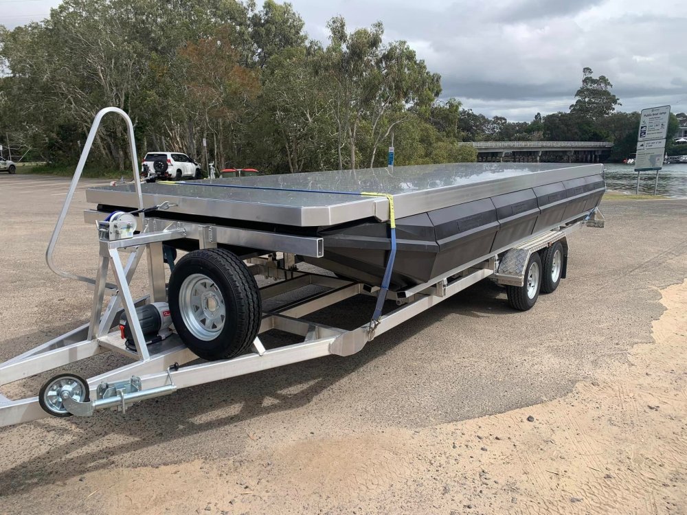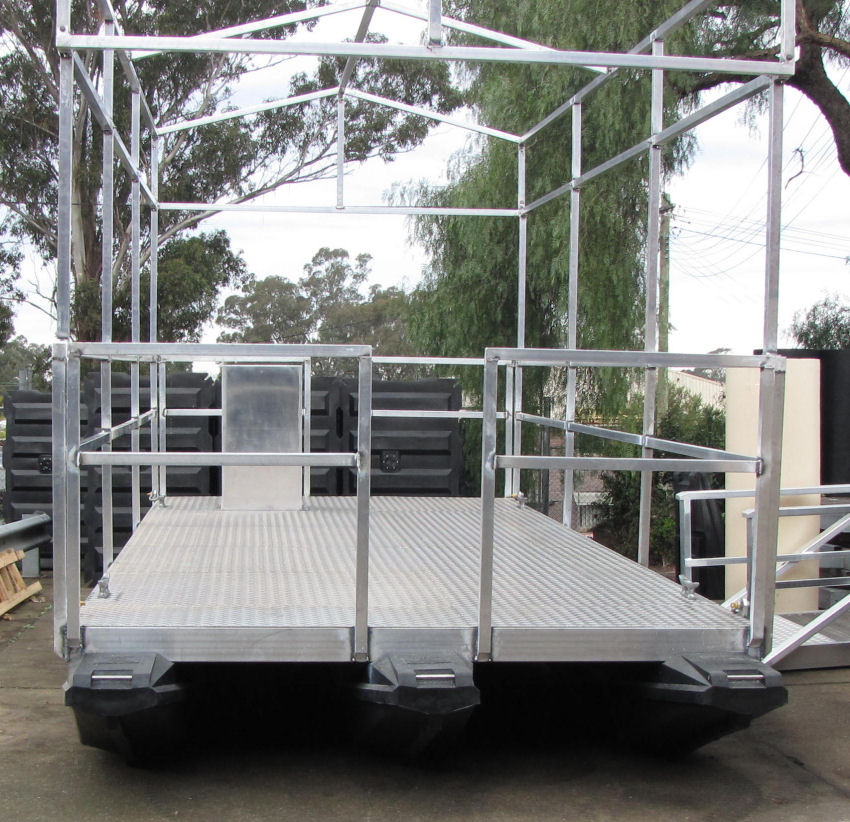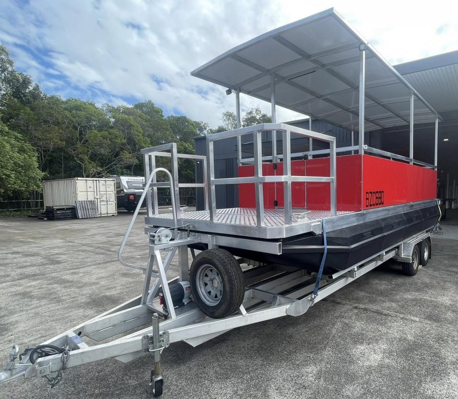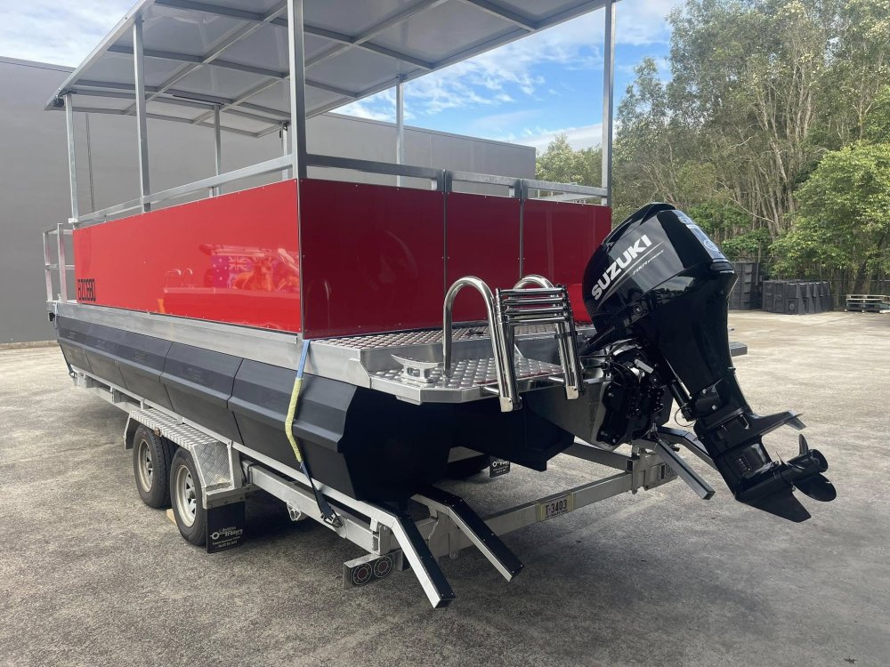 Shown here with alloy access ramps, storage toolbox, motor bracket with step, handrails, and control console. This boat was made to transport quad bikes.