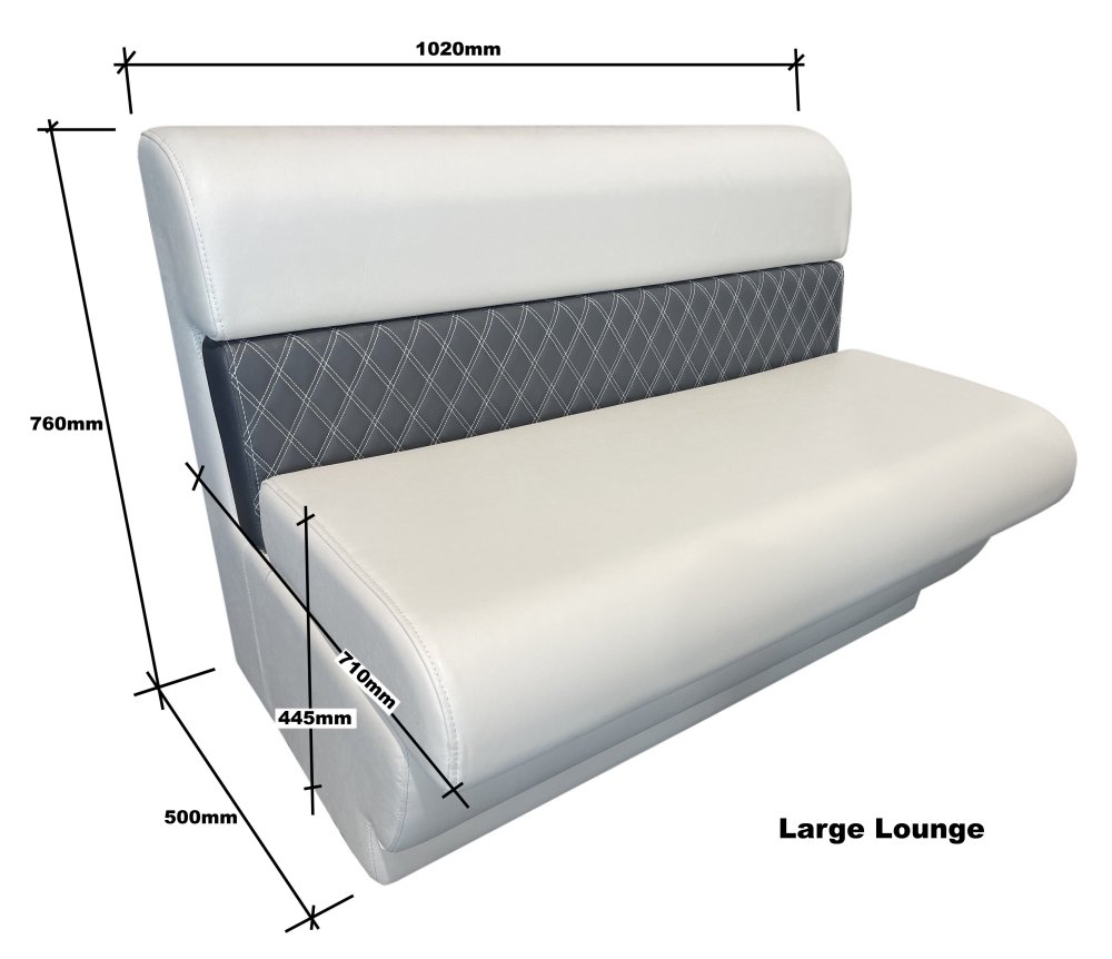 Upholstered large pontoon lounge with lift up seat for storage. Roto moulded poly base with upholstered UV stabilized vinyl covering. Can be used in a row or match it in with other lounge section. Great for use in pontoon BBQ Party boats or caravans.