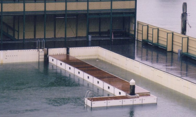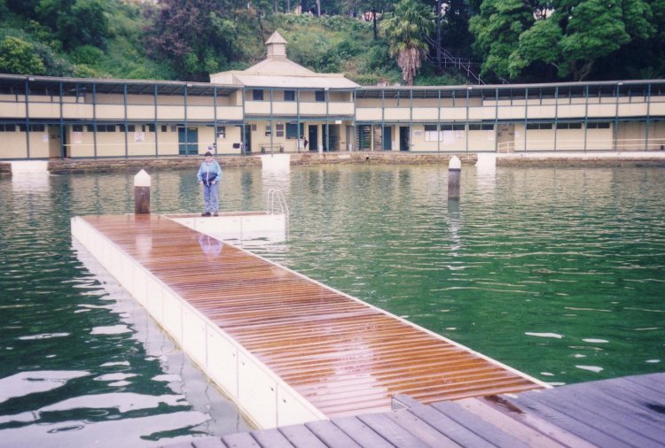These are pictures of pontoons in Sydney Harbour Sydney Australia. All with Marine Dock Systems floats under them. Some recent, some built in 1980 and still going strong. There is a mix of timber framed pontoons decked with hardwood. Aluminium framed pontoons deck with hardwood timber. Aluminium frames with concrete decking. A lot of these photos also have our aluminium ramps / gangways on them. Some of these pontoons were built by someone else on our Marine Dock Systems floatation modules. Please veiw the photo's to see just what is possible with our universal pontoon system.
